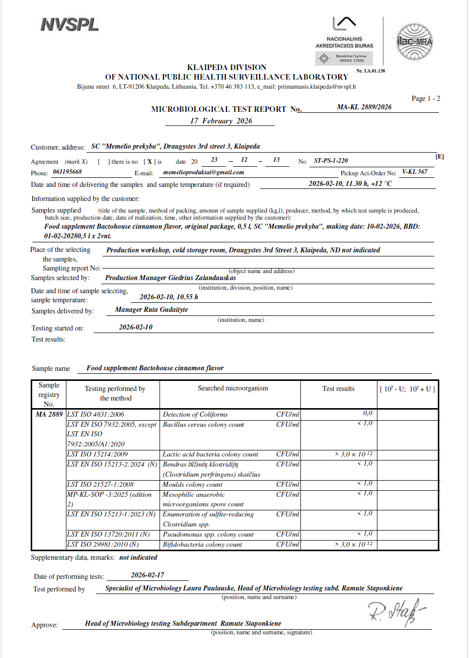 BACTOHOUSE products are regularly tested at the National Public Health Laboratory, the KTU Food Research Centre, Klaipėda University, the National Institute for Food and Veterinary Risk Assessment, the Hamilton Laboratory in Poland and the Sequench Laboratory in New Zealand. The actual content of good bacteria is even higher than declared on the label. 1×10⁹ CFU means one billion colony-forming units, while 1×10¹⁰ means ten billion! And that’s just in one millilitre of the product – imagine how many are in the whole bottle!